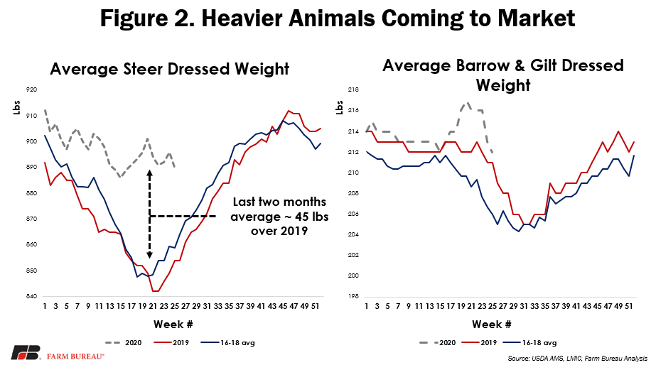 Due to COVID-19-related labor issues, slaughter facility capacity dropped sharply in April and May. At its worst in early May, cattle slaughter dropped 35% from 2019 and hog slaughter dropped 35% from the previous year. Slaughter capacity has largely recovered to near normal levels — more quickly than most in the industry anticipated. We are by no means out of the woods yet and face a large backlog of animals in the system that will remain with us through at least the early fall. Fed cattle slaughter has settled around 95% of full capacity, but this may be the most that the industry can accomplish given the measures put in place at facilities to combat the spread of COVID-19. Hog slaughter has returned to above 2019 levels and is mostly in line with its pre-COVID-19 trajectory. Maintaining these higher slaughter levels will be critical to working through the backlog of animals. This is particularly true of the pork complex, as previous USDA hog and pig reports indicate a larger volume of animals in the pipeline for later in the summer, meaning there may not be much room at slaughter facilities to clear additional animals that have backed up. The breeding decisions that resulted in this larger volume were made long before the impacts of COVID-19 could be imagined.
