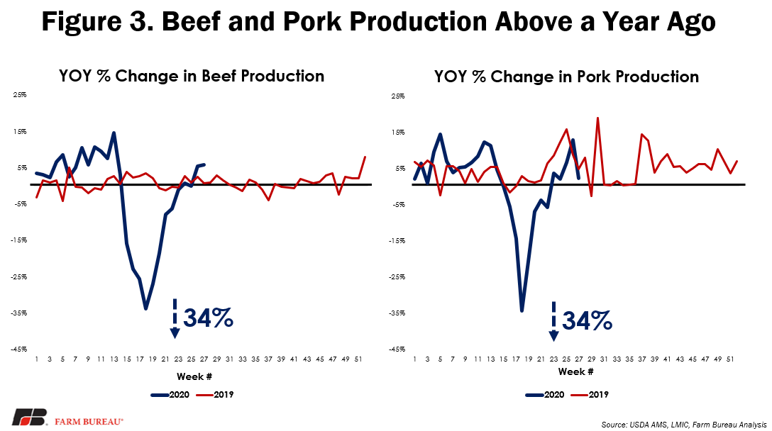 As the backlog of animals in the system forces producers to hold on to animals longer, they continue to gain weight before moving to slaughter. This has resulted in an increase in live and dressed weights of animals in the supply chain, creating a problem with cattle carcass weights. As evidenced in Figure 2, cattle carcass weights tend to seasonally decline and bottom out in late spring, then rebuild to a peak in October or November. This year, carcass weights have mostly held steady throughout the summer because of the slowdown of throughput at the plants the last few months and the backlog of animals that slowdown created in the country’s feedyards. Over the previous two months, dressed steer carcass weights have averaged approximately 45 pounds over 2019 weights. These above-average carcass weights will likely be with us for several more months before returning to their normal pattern. Hog carcass weights have not been affected to the same degree as cattle, but we still have seen an uptick in carcass weights for market hogs. The developments in animal weights leads us to our next point, the resulting increase in meat production.