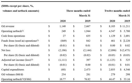 (1) Operating netback is a non-IFRS measure and includes realized gain (loss) on financial instruments. Operating netback per bbl is calculated by dividing revenue (including realized gain (loss) on financial instruments) less royalties and operating costs by the total production of the Company measured in bbls. A reconciliation of the measures can be found on page 8 of the Company’s management’s discussion and analysis for the Q4 and fiscal year ended March 31, 2020.