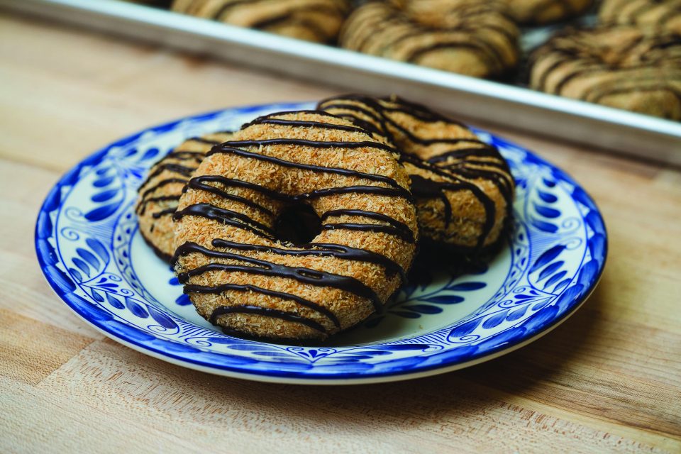 “It is important for us to have craveable and approachable treats executed at a high level that will make you a little bit happier than when you walked into the door,” says pastry chef Aya Fukai, 38, understating the sublime experience of savoring her scrumptious Samoa cakes—one of her most popular creations. Made with a moist chocolate buttermilk cake, frosted with dulce de leche buttercream, tossed in toasted coconut, and drizzled with chocolate for a crunch, Aya Pastry’s Samoa cake is everything a cake is supposed to be: a perfect mix of texture and flavor in every single bite, with the added portability of a doughnut. “The Samoa cake was created because my personal favorite Girl Scout cookie is the Samoa,” says Fukai. “I love cakes in general, and I wanted to create a cake version of my favorite cookie. I have always liked the personal/individual cake aspect of a cupcake but never was a fan, due to the ratio of frosting to cake. I wanted to make a handheld dessert with the frosting-to-cake ratio that I liked and with different textures,” she says. Texture is definitely the highlight of Aya Pastry’s Samoa cake—a gentle crunch from the chocolate covering is followed by the moist softness of the cake and frosting. The flavors are beautiful too, a classic combo of coconut and chocolate that’s tastefully sweet, unspoiled by any weird gimmicks. Comfort food at its best.