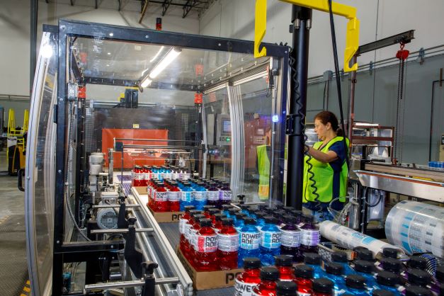 Once through the assembly line, cases enter a computer-controlled mechanical palletizer, which automatically builds precise loads of variety-packed case beverages on pallets, securely shrink-wraps the pallet, and stages them for loading on to trucks.