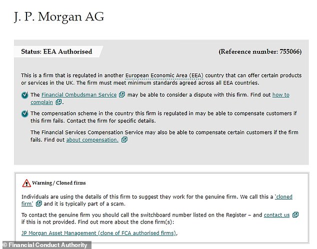 According to the register, the FCA is aware that the details of JPMorgan’s German business are being used by fraudsters and placed JPMorgan Asset Management on its blacklist last November.