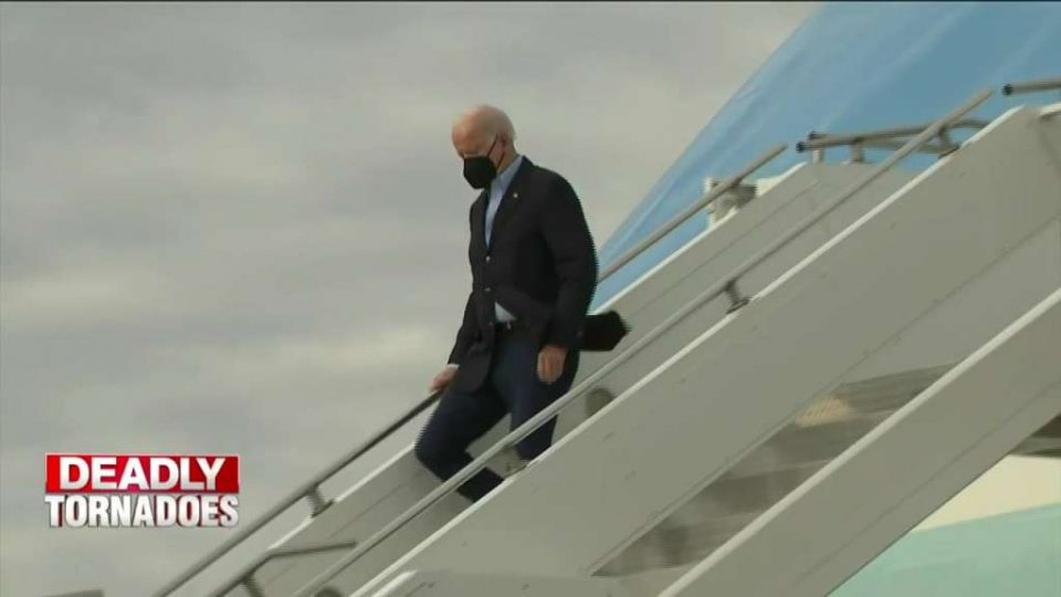 Biden also took an aerial tour of the damage and held a briefing with officials in an airport hangar. “I’m here to listen,” he said. This kind of tragedy, Biden said, “either brings people together or it knocks them apart.”