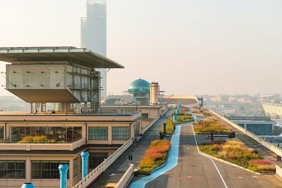 And here we stand, on the roof of the former Lingotto FIAT factory in Turin, Italy, where architecture firm Benedetto Camerana covered what was a test track—where since 1923 gasoline-powered FIAT cars zipped around in circles after rising up through five floors of the factory—with flowers. It’s all wonderfully symbolic.