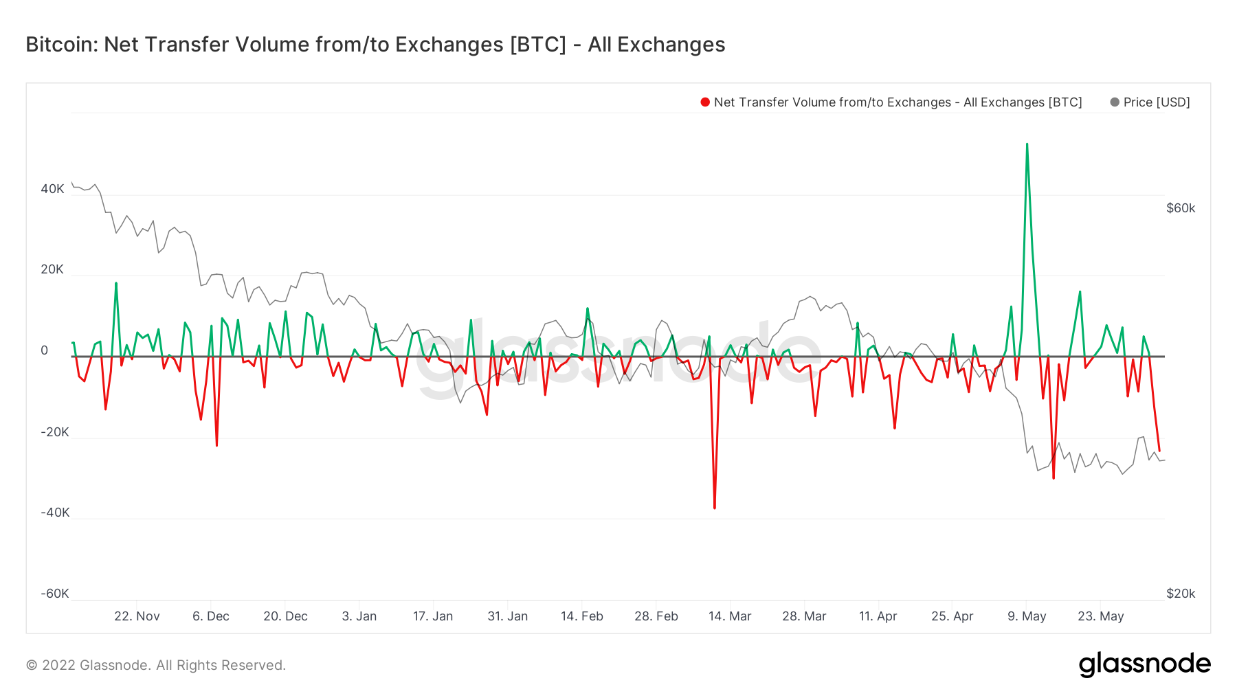 According to on-chain analytics firm Glassnode, on June 3, netflows from major exchanges totaled -23,286 BTC, the most since May 14.