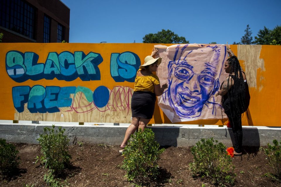 Artists Julie Bergeron (left) and Jasmine Countryman (right) hold up a portrait of Brother Carl who is going to be painted as part of the mural at the old Swift Factory building Saturday, July 18, 2020, in Hartford. Brother Carl is “the hood’s uncle,” said John Massey, another artist. Massey said Brother Carl is a local youth enthusiast and anti-violence activist. (Kassi Jackson/The Hartford Courant)