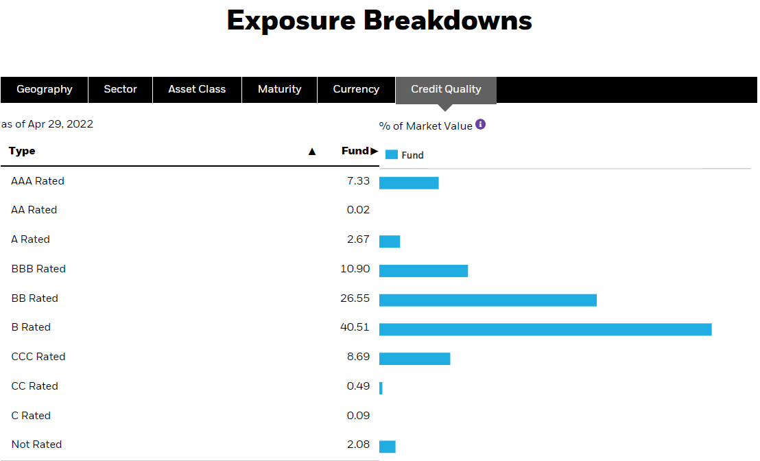 BLW’s holdings are generally of very low credit quality, with the fund’s underlying holdings sporting an average credit rating of B. Bonds with these ratings are issued by companies with comparatively weak financials and balance sheets, and are relatively risky, speculative securities. Defaults are somewhat common, and spike during recessions and downturns, leading to lower bond prices and capital losses. Expect moderate / high losses during downturns and recessions, amplified by the fund’s 1.60x leverage ratio.