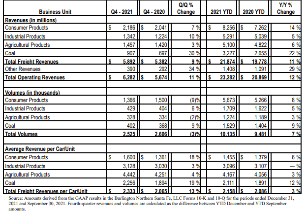 Net income was $1.7 billion for the company in the fourth quarter of 2021, compared with net income of $1.5 billion in the fourth quarter of 2020. BNSF (NYSE: BRK.B) is privately held by Berkshire Hathaway.