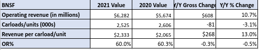 Fourth-quarter operating income rose 12% to $2.4 billion. BNSF’s operating ratio was 60%, compared with 60.3% in the fourth quarter of 2020. Investors sometimes use OR as an indicator of the financial health of a company, with a lower OR implying improved financial health.