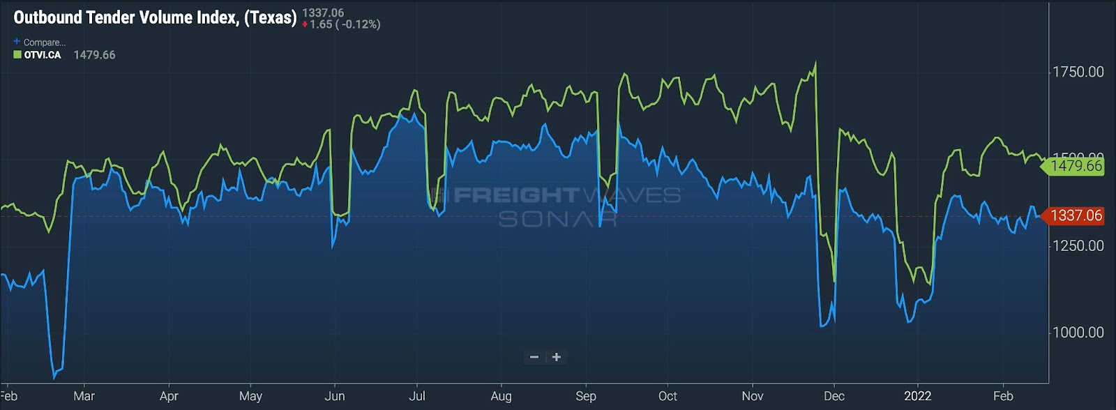FreightWaves’ Outbound Tender Volume Index — monthly change signals which markets are experiencing prolonged volume growth or contraction — shows both Texas and California have grown over the past month and a half.
