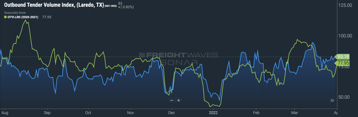 According to FreightWaves’ SONAR platform, the outbound tender volume index in Laredo, Texas (OTVI.LRD), declined about 8% week-over-week, but has increased about 3% since Tuesday. Laredo is a key port of entry for cross-border freight on the U.S.-Mexico border.