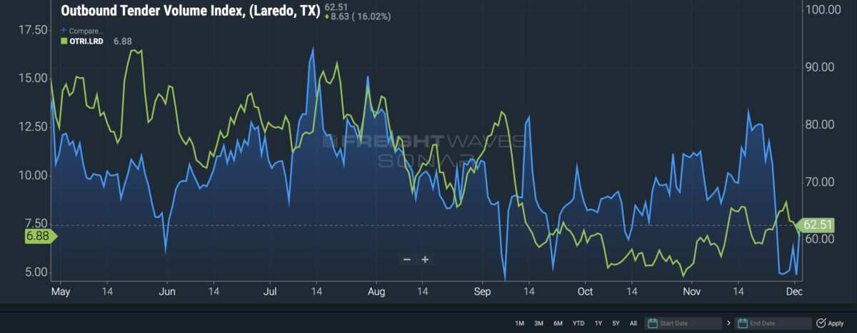 Laredo’s outbound tender volume index (OTVI.LRD) — a measure of shipper requests for truckload capacity — increased about 16% since the first of the month, while the outbound tender rejection index (OTRI) — the rate at which these requests are rejected by carriers — has fallen almost 20% week-over-week.