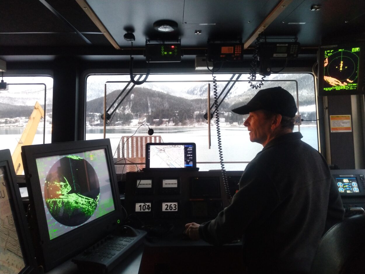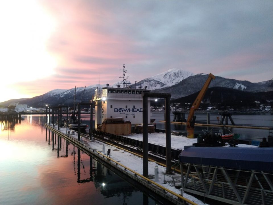 The morning sun has just risen over the Alaska Marine Lines facility on Gastineau Channel. From the wheelhouse, skipper Mark Hesse is edging into one of Juneau’s freight docks on this cold, sunny Thursday morning. He’s the captain on a five-person crew preparing to load Hoonah-bound shipping containers on the Unalaq, a 196-ton black and white landing craft.