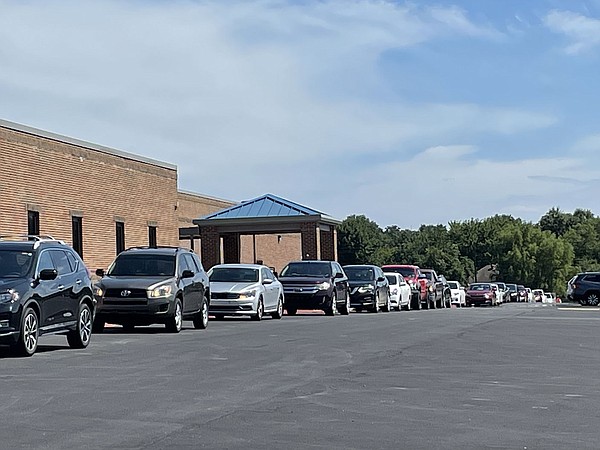 Spencer Bailey/Siloam Sunday A line of cars is seen outside Siloam Springs Intermediate School during Bright Futures’ backpack giveaway and supply distribution event Thursday. The line later went on to be wrapped around the building as volunteers worked in the heat to deliver school supplies to local families.