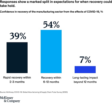 Overall, 39 percent of respondents are confident that the manufacturing sector will recover rapidly from disruptions caused by COVID-19, according to a study by McKinsey, estimating that as little as two to three months will be sufficient. However, 61 percent expect that recovery will take at least six months.