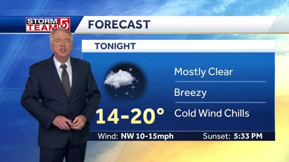 TERRIBLY WARM. TONIGHT, CLEAR, BREEZY, WIND CHILLS DROPPING TO THE TEENS AND SINGLE DIGITS. 14 TO 20 FOR YOUR OVERNIGHT LOWS. TOMORROW, IT LOOKS GREAT AS YOU LOOK OUTSIDE, BUT KIND OF COLD AND A BIT BREEZY AS WELL, 32 TO 38. TODAY, WE LOST THE SUNSHINE DURING THE AFTERNOON. TOMORROW, WE WILL HAVE PLENTY OF SUNSHINE GOING ON. THE CLOUD COVER THAT WE HAVE OVER THE CAPE MOVED ON OUT OF HERE, BY TOMORROW MORNING AT 8:00 A.M., NOTHING BUT SUNSHINE. IT STAYS THAT WAY ALL DAY. AS WE JUMP AHEAD TO MONDAY, WE START TO GET SOME CLOUDS COMING IN HERE, BUT NO RAIN OR ANYTHING HAPPENING UNTIL LATE MONDAY NIGHT, SO LET ME SHOW YOU WHAT IS GOING TO HAPPEN. THE SYSTEM COMING IN FROM THE WEST WILL DRAG MORE MILD AIR IN HERE. WE SAY GOODBYE TO THE COLD FOR THE WEEKEND, BY MONDAY, WARMING INTO THE 50’S. BY TUESDAY, WELL INTO THE 50’S. MONDAY NIGHT, WE HAVE SHOWERS MOVING I HERE, EARLY TUESDAY MORNING. ANOTHER BATCH OF RAIN STARTS MOVING IN HERE. THIS ONE MOVES THROUGH ON WEDNESDAY. THAT IS WHERE WE HAVE MORE RAIN THAN ANYTHING ELSE. WE WILL CLEAR THINGS AWAY ON THURSDAY. THIS SYSTEM TO THE WEST WILL MAKE ITS — WILL MAKE ITS RUN TO US ON FRIDAY. THE COLDER AIR WILL RUN INTO THE FORECAST WE BREAK IT DOWN TO THE NEXT SEVEN-DAY FORECAST TO SHOW YOU WHAT HAPPENS. TOMORROW, 36, WARMER ON MONDAY, A FEW MORE CLOUDS, RAINS MONDAY INTO TUESDAY. TUESDAY AFTERNOON, WE DRY OUT, 56 DEGREES. ANOTHER BATCH OF RAIN ON WEDNESDAY, STILL 54 DEGREES, AND THAT IT CLEARS AWAY. THURSDAY IS NOT BAD, 48 DEGREES. AND HERE COMES THIS LITTLE SYSTEM ON FRIDAY AND SATURDAY, POSSIBLY SEEING A LITTLE MIXED WITH IT. I AM NOT LOOKING FOR ANY ACCUMULATION, MORE WET SNOWFLAKES MIXED IN WITH THE SHOWER POTENTIAL THAN ANYTHING ELSE, BUT YOU WILL SEE ALL THE TEMPERATURES COOL DOWN AND WE GET COLDER WEEKEND. TOMORROW IS THE C