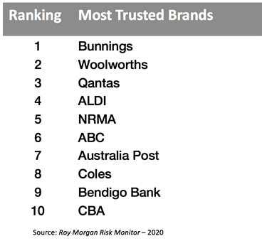 At the height of the COVID-19 pandemic, Bunnings, Woolworths and Qantas were selected by Australians as their most trusted brands – with Commonwealth Bank the big mover.
