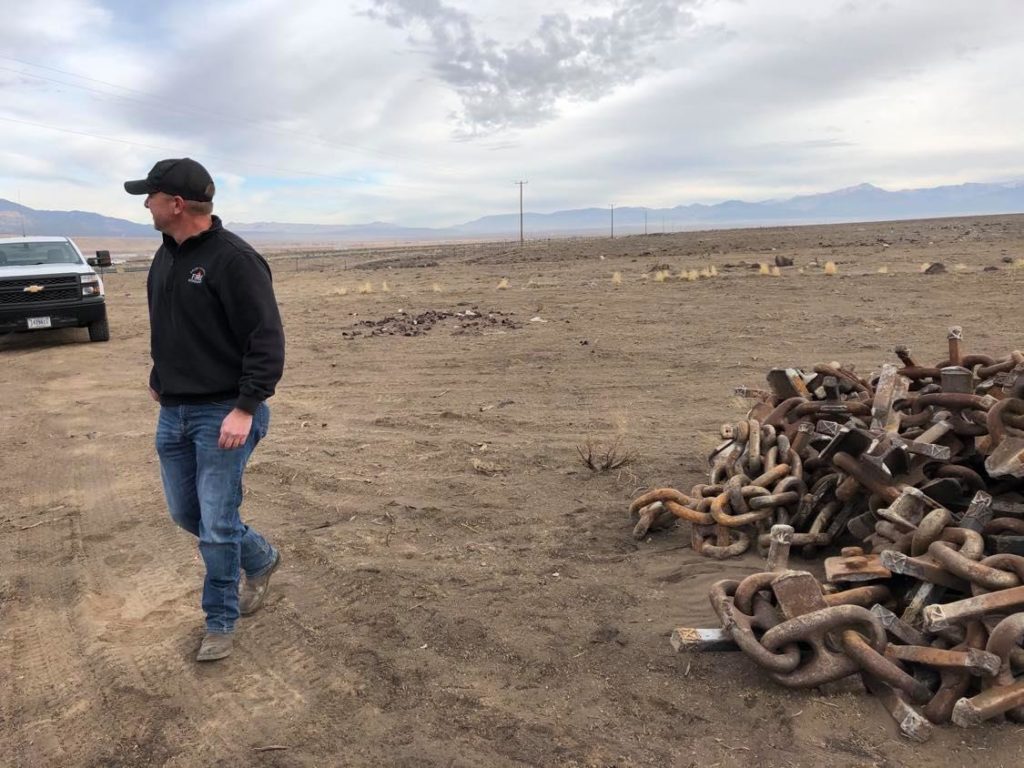 Peterson said the chain is approximately 180-feet long, with 60 to 80-pound links, that is pulled between two bulldozers. A swivel causes the chain to turn and dig down about 8 to 10 inches. This process is used after aerial seeding to help bury the seeds.