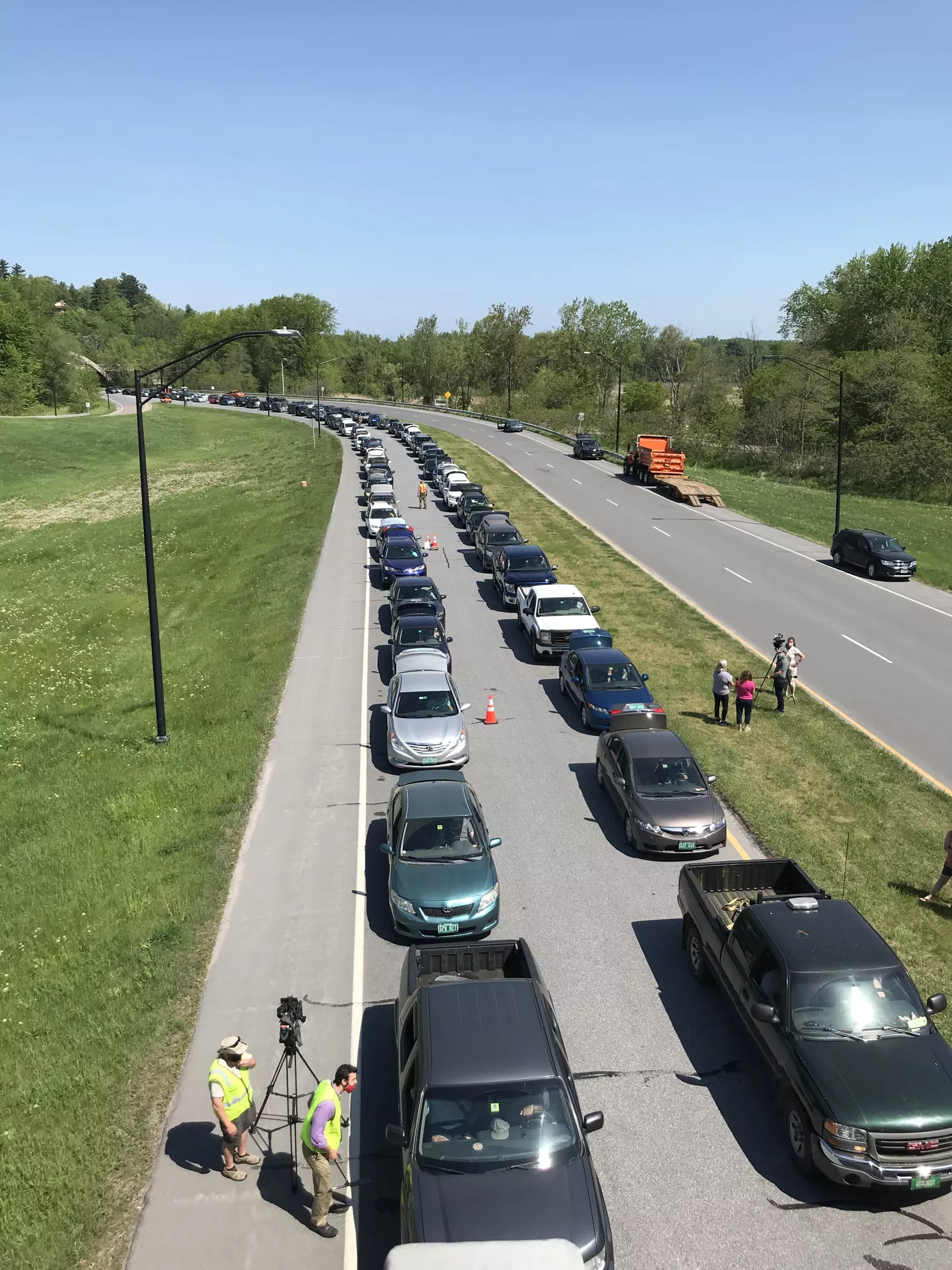 A Burlington builder flashed a V sign out the window of his Ram 2500 as he steered his pickup under an overpass on the Beltline Tuesday morning. His victory was being No. 1 in a long line of cars at a food distribution site in Burlington’s New North End.