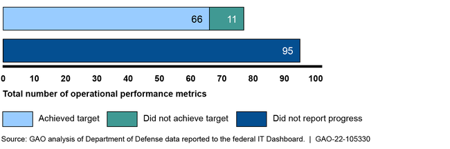 Programs also reported operational performance data to the federal IT Dashboard. As of December 2021, the 25 programs collectively identified 172 operational performance metrics consistent with Office of Management and Budget (OMB) guidance. These metrics covered a range of performance indicators such as the timeliness of program deliverables and the percentage of time that systems were available to users. However, programs only reported progress on 77 of the 172 operational performance targets. (See figure.)