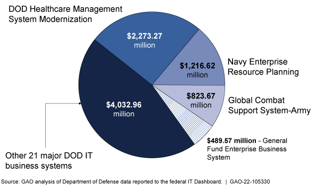 To address these objectives, GAO determined that DOD’s major IT business programs were the 25 that DOD reported to the federal IT Dashboard as of December 2021 (The IT Dashboard is a public website that includes information on the performance of IT investments). GAO examined DOD’s planned expenditures for these programs from fiscal years 2020 through 2022, as reported in the department’s FY 2022 submission to the Dashboard.