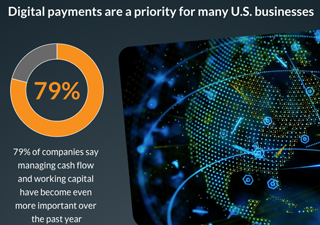 To help offset the impact of inflation, U.S. businesses are prioritizing access to working capital and managing cash flow, American Express says. For example, 79% of businesses say managing cash flow and working capital have become even more important over the past year. 48% note the digitization of payments has already helped reduce costs. Most businesses also are planning to increase their current degree of automation, with 56% saying this about payments to suppliers.