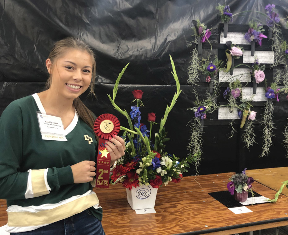 In photo at the top, Cal Poly freshman Kassidy Talbot with her second-place winning entry at the California State Floral Association’s 14th annual student competition.