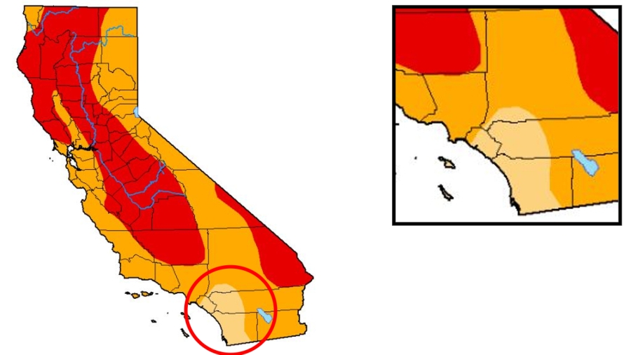 That’s music to the ears of people like Jeff Stephenson, a water resources manager at San Diego County Water Authority. If you glance at a map of California from the U.S. Drought Monitor, it becomes apparent why. In a sea of dark orange and red, indicating “severe” or “extreme” drought, there’s a lighter patch about the size of San Diego County.