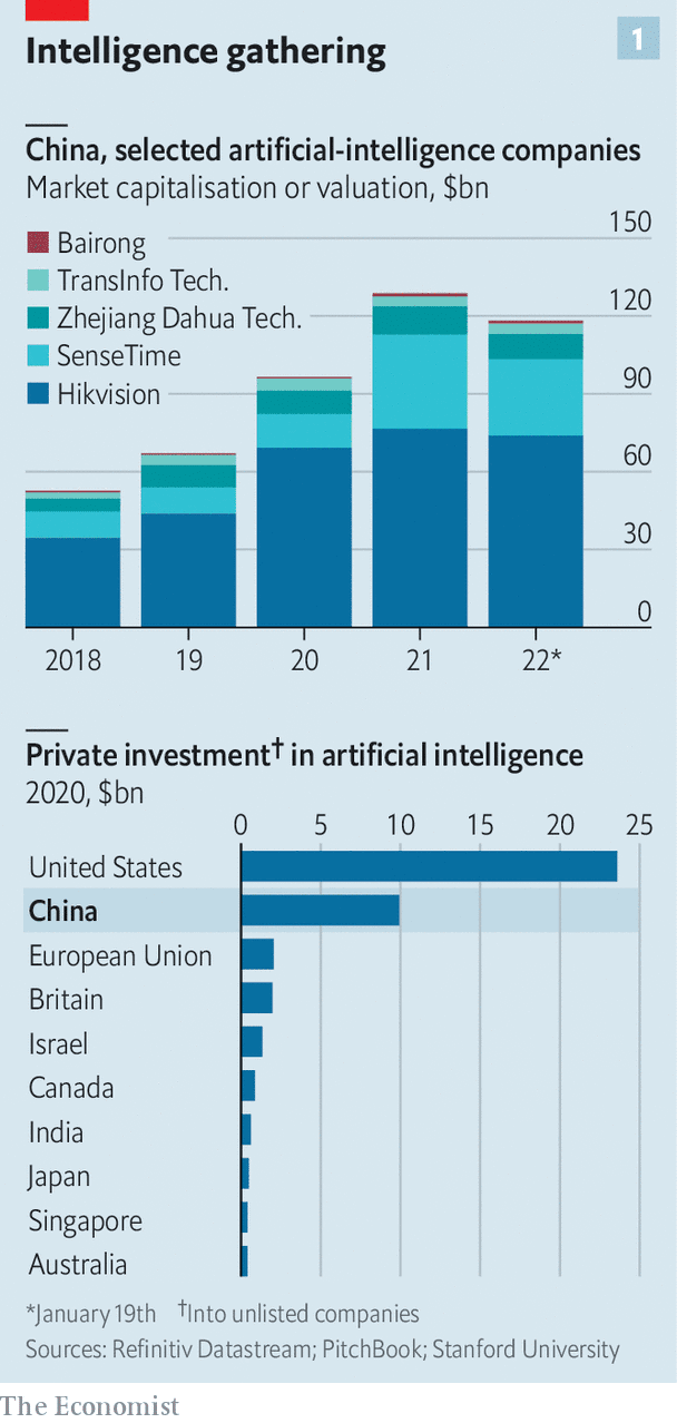 The five most prominent listed Chinese AI specialists are collectively worth nearly $120bn (see chart 1). The biggest of them, Hikvision, has a market value of $60bn. SenseTime, which went public in Hong Kong on December 30th, is worth $28bn. Two more are expected to list soon. In 2020 investments in unlisted AI startups reached $10bn, according to the AI Index compiled by researchers at Stanford University. In its prospectus SenseTime forecasts that revenues from AI-assisted image-recognition and computer-vision software, the most mature part of the market, could hit 100bn yuan ($16bn) by 2025, up from 24bn yuan in 2021 (see chart 2).