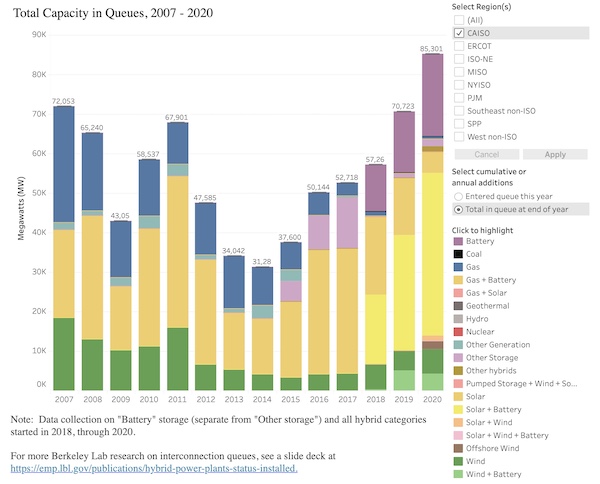 Data visualization of CAISO’s queue at end of each year. Source: Berkeley Lab