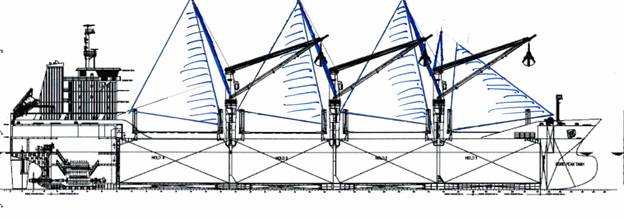 While it is starting to look like some clever wind/power sail technologies are starting to appear, too often I have looked at the cargo cranes of geared bulkers and wondered if it makes sense to rig some sort of sail on them.