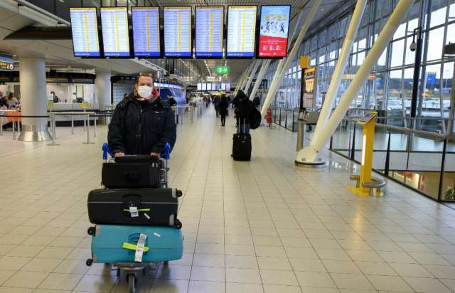 A traveler wearing a protective face masks pushes his luggage on a cart in Amsterdam Schiphol airport on February 2, 2020.