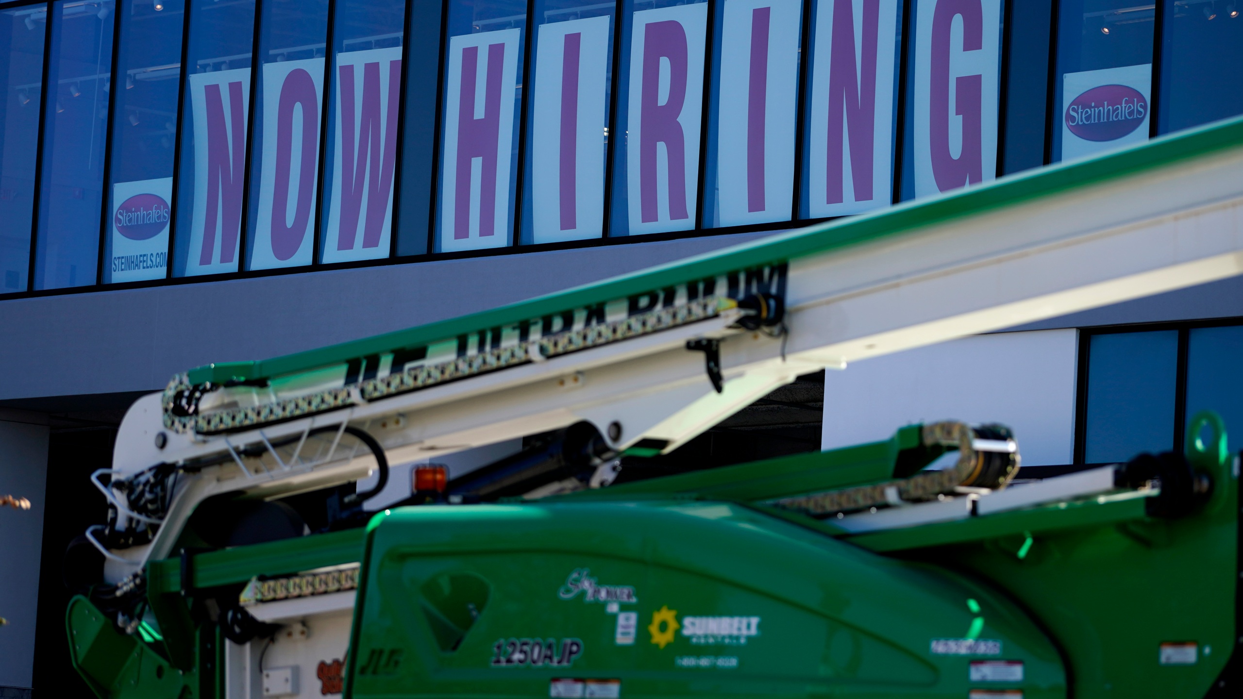 A hiring sign is displayed at a furniture store window on Friday, Sept. 17, 2021, in Downers Grove, Ill. Unemployment claims dropped 6,000 to 290,000 last week, the third straight drop, the Labor Department said Thursday, Oct. 21, 2021,. That’s the fewest people to apply for benefits since March 14, 2020, when the pandemic intensified. (AP Photo/Nam Y. Huh)