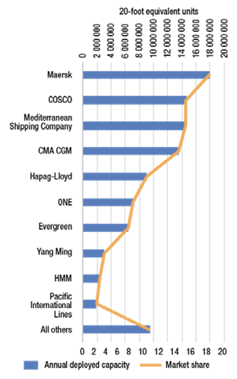 Figure 1 Top 10 deep-sea container shipping lines, ranked by deployed capacity and market share, May 2020