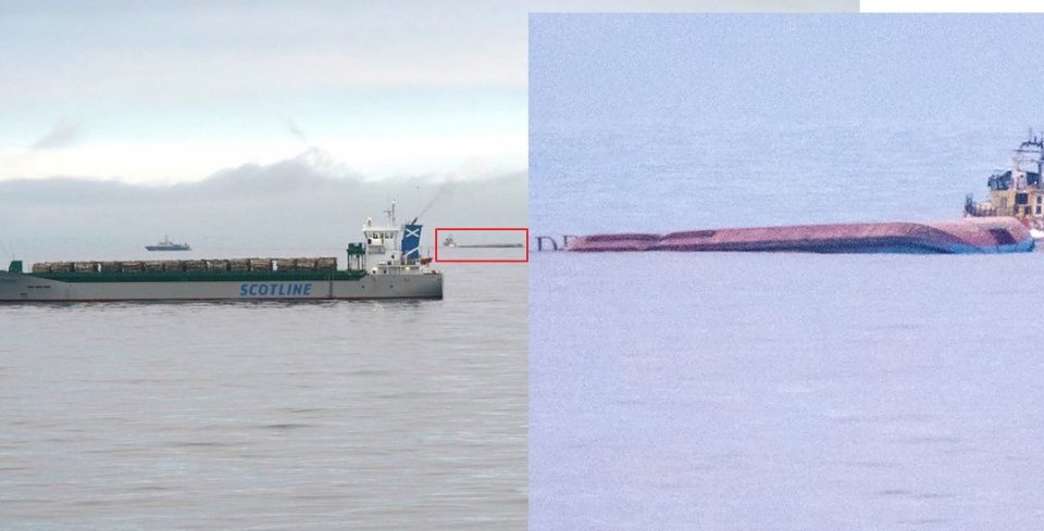 The 55-metre Karin Hoej barge and 90-metre Scot Carrier were sailing in the same direction when they hit each other in Swedish territorial waters, officials said. The overturned Karin Hog was later towed away in waters full of wreckage.