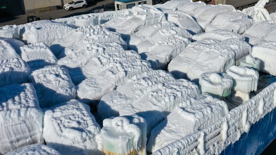 En route to Russia, the Japanese ‘Sun Rio’ cargo carrier experienced temperatures at around -19C with high winds at sea. Waves splashed onto the deck of the cargo ship and froze the cars – both new and second-hand imports.