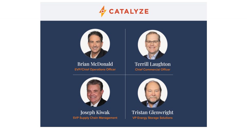 BOULDER, Colo.–(BUSINESS WIRE)–Catalyze, a clean energy transition company that builds, owns and operates solar, battery storage and electric vehicle (EV) charging systems for commercial and industrial customers, announced the expansion of its executive suite with the hires of four energy sector veterans. Former electric power industry executive Brian McDonald joins as EVP/Chief Operations Officer (COO), former digital solutions and demand response executive Terrill Laughton joins as Chief Commercial Officer (CCO), energy sector supply chain executive Joseph Kiwak joins as Senior Vice President (SVP) of Supply Chain Management, and former Tesla and SolarCity leader Tristan Glenwright joins as Vice President (VP) of Energy Storage Solutions.