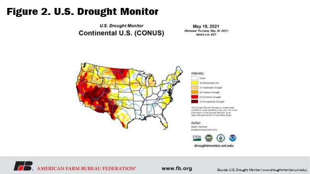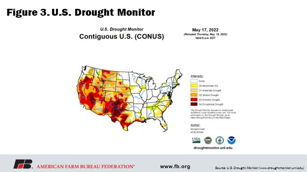 While the report fails to explain how feedlot placements are even with last year while inventory numbers and calf crop are down, drought may be a part of the answer. Much of the Western United States, as well as the southern Plains, have experienced or are continuing to experience drought conditions. When this happens, it is not uncommon for ranchers in the Southern plains to move grazing cattle off wheat early. It is also a possibility that heifers previously listed as replacements are being placed into feedlots. Adjustments to Jan. 1 inventory numbers are not uncommon and may better reflect the situation as 2022 continues.