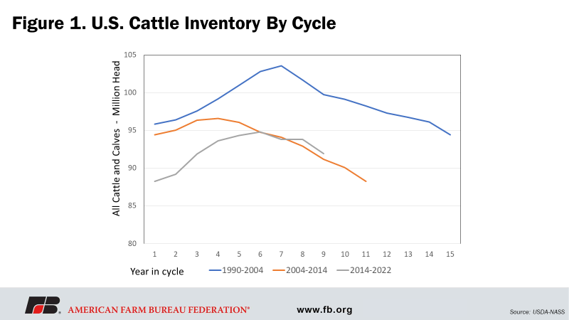 The last piece of this puzzle is supply and slaughter. Commercial cattle slaughter for April was 2.81 million head, down slightly from 2021. Steer slaughter was 1.33 million, 4% lower than 2021. Heifer slaughter for the month of April came in at 825,200, .05% lower than this time in 2021. Cow slaughter for the month of March came in at 640,382, 7% higher than the same time in 2021. It’s important to acknowledge the decrease in slaughter in all commercial cattle and the increase in cow and heifer slaughter. This illustrates industry position in the cattle cycle. Figure 1. illustrates the current and past two cattle cycles.