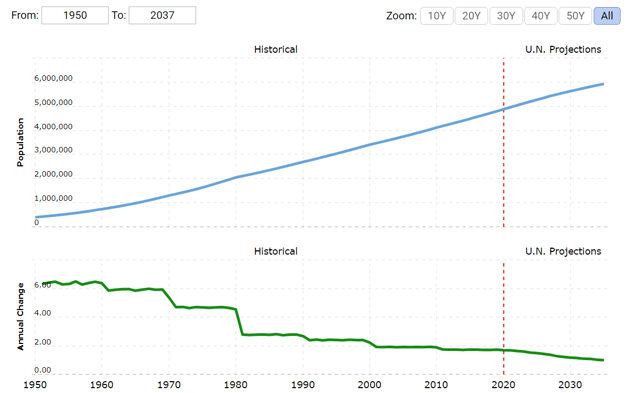 Monterrey population and growth rate data and projections, 1950-2037. Source
