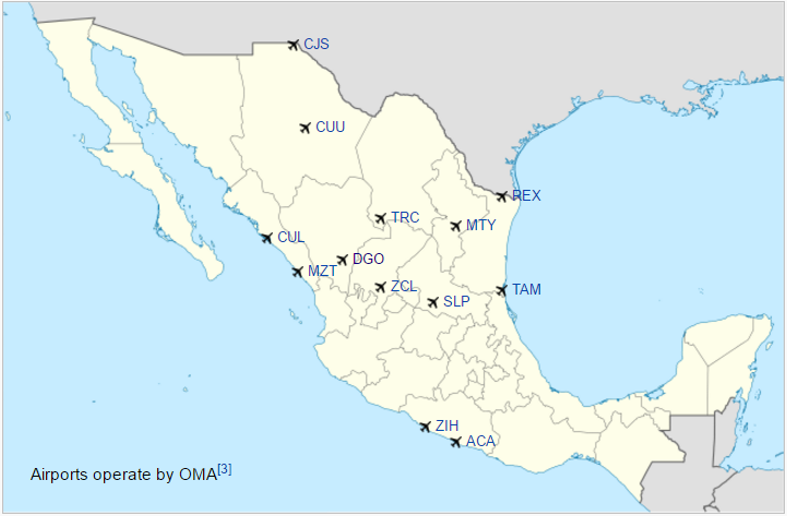 I won’t cover too much backstory on OMAB as I’ve written about the company several times, previously. But for those unfamiliar, OMAB (aka OMA in Mexico) operates 13 Mexican airports, primarily in the northern part of the country: