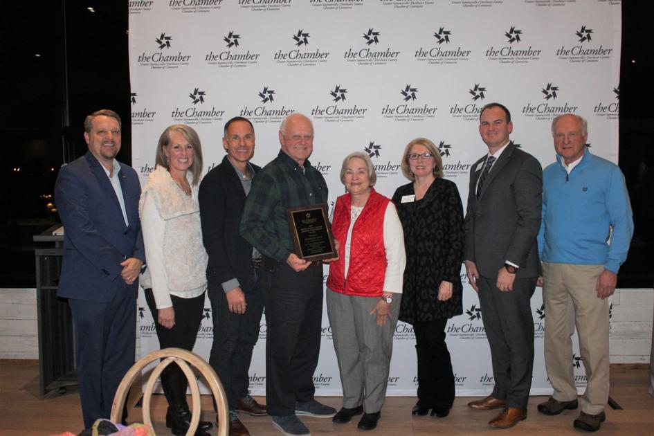 2019 Chamber Volunteer of the Year Don Nye (from left) First National Bank of SC Senior VP Todd Buddin, Martha Nye, Don Nye, Summerville Chamber 2019 Board Chair Scott Runyon, and Chamber President/CEO Rita Berry.