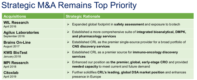 The backdrop is promising but there are also company-specific reasons to like Charles River in today’s environment. For years the company has appeared to be well-positioned for the future but that did not stop management from putting money to work. For example, Charles River has invested around $2B in strategic acquisitions over the last 4 fours.