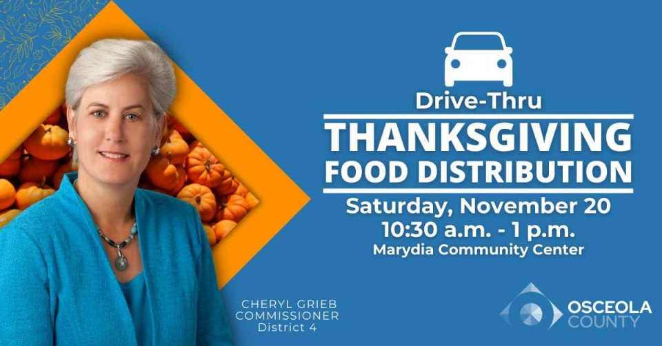 District 4 Commissioner Cheryl Grieb is inviting the community to a free, drive-thru Thanksgiving Food Distribution Saturday, November 20, from 10:30 am to 1 pm at the Marydia Community Center, located at 707 Sawdust Trail in Kissimmee