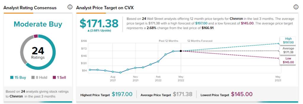 Turning to Wall Street, Chevron has a Moderate Buy consensus rating based on 15 Buys, eight Holds, and one Sell rating assigned in the past three months. The average Chevron price target of $171.38 implies 2.7% upside potential.