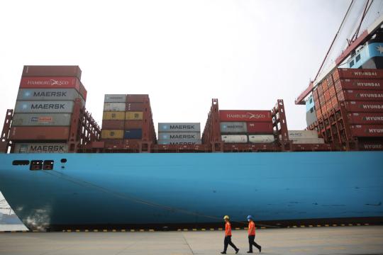 Two employees walk past the container terminal of Qingdao Port, Shandong province. (Photo by Zhang Jingang/For China Daily)