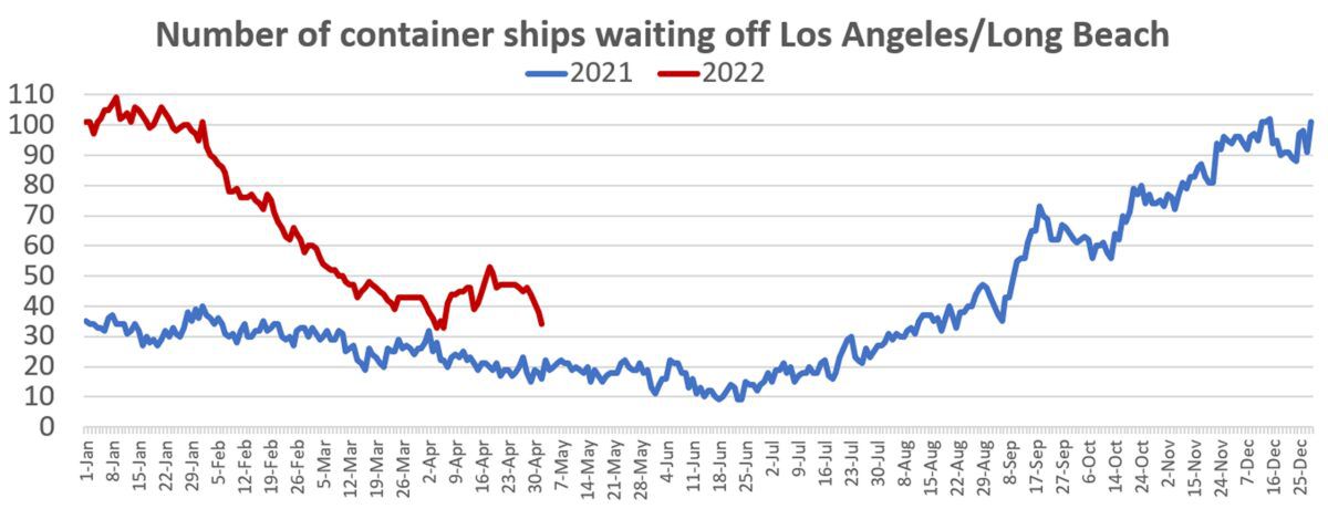 There were 34 container ships waiting for Los Angeles/Long Beach berths on Tuesday, according to the Marine Exchange of Southern California. That’s just one shy of the lowest number of ships waiting this year, but it’s still more than double the queue size at this time last year.