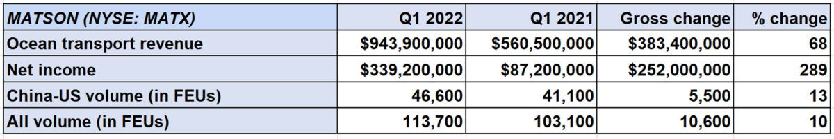 Matson (NYSE: MATX) is a niche carrier that offers domestic services to Alaska, Hawaii and Guam in addition to China-U.S. services. Its ocean transport revenues rose 68% year on year, to $943.9 million in Q1 2022. Net income was $339.2 million, up 289% from $87.2 million in Q1 2021.