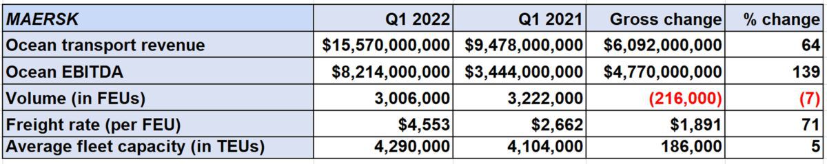 The Maersk group, which owns the world’s second largest ocean carrier, reported net income of $6.8 billion for Q1 2022 compared to $2.7 billion in Q1 2021. Group earnings before interest, taxes, depreciation and amortization came in at an all-time high $9.2 billion.