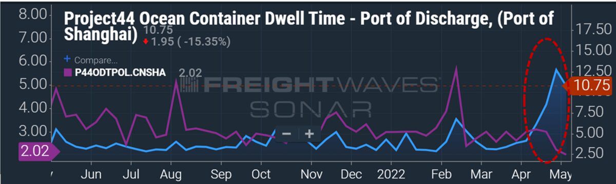 Data from project44 confirms a lack of disruption to export operations within the Port of Shanghai. It shows that average wait time for export containers at the Port of Shanghai bound for destinations like the U.S. has actually decreased during the lockdown. In the last week of April, it was down 43% year on year to 2.02 days. Wait time for import containers has risen during the lockdown (due to a shortfall of truck transport inland) but this indicator retreated 15% in the last week of April versus the week before, to 10.75 days